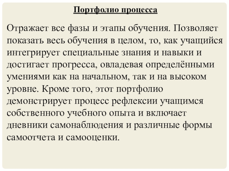 в целом, то, как учащийся интегрирует специальные знания и навыки и достигает прогресса, овладевая определёнными умениями как на начальном, так и на высоком уровне. Кроме того, этот портфолио демонстрирует процесс рефлексии учащимся собственного учебного опыта и включает дневники самонаблюдения и различные формы самоотчета и самооценки.