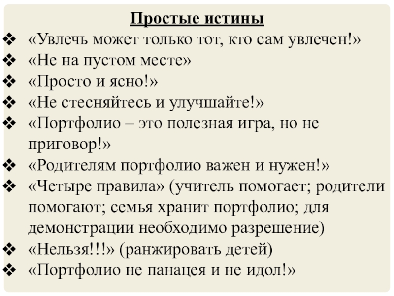 «Четыре правила» (учитель помогает; родители помогают; семья хранит портфолио; для демонстрации необходимо разрешение)