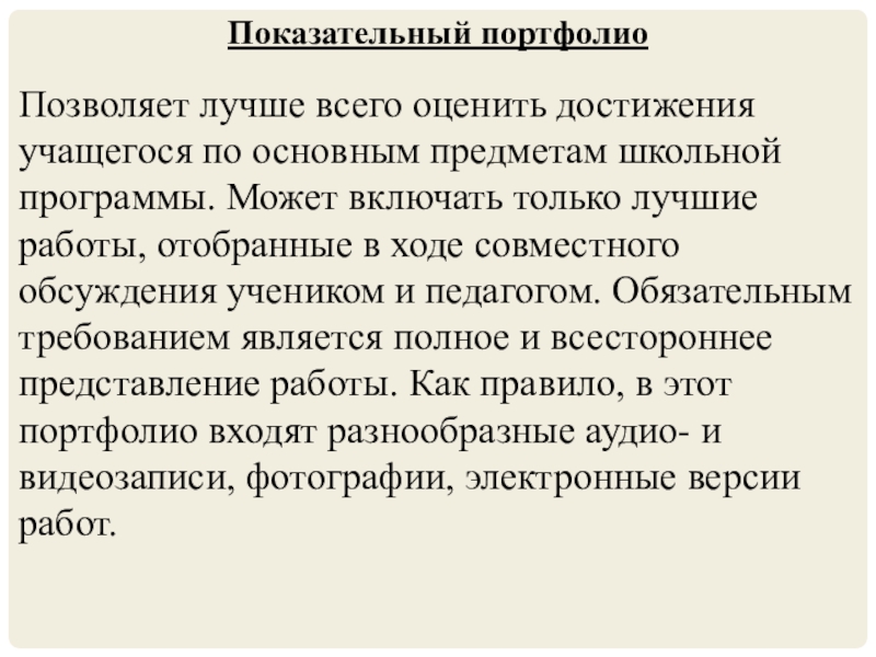 программы. Может включать только лучшие работы, отобранные в ходе совместного обсуждения учеником и педагогом. Обязательным требованием является полное и всестороннее представление работы. Как правило, в этот портфолио входят разнообразные аудио- и видеозаписи, фотографии, электронные версии работ.