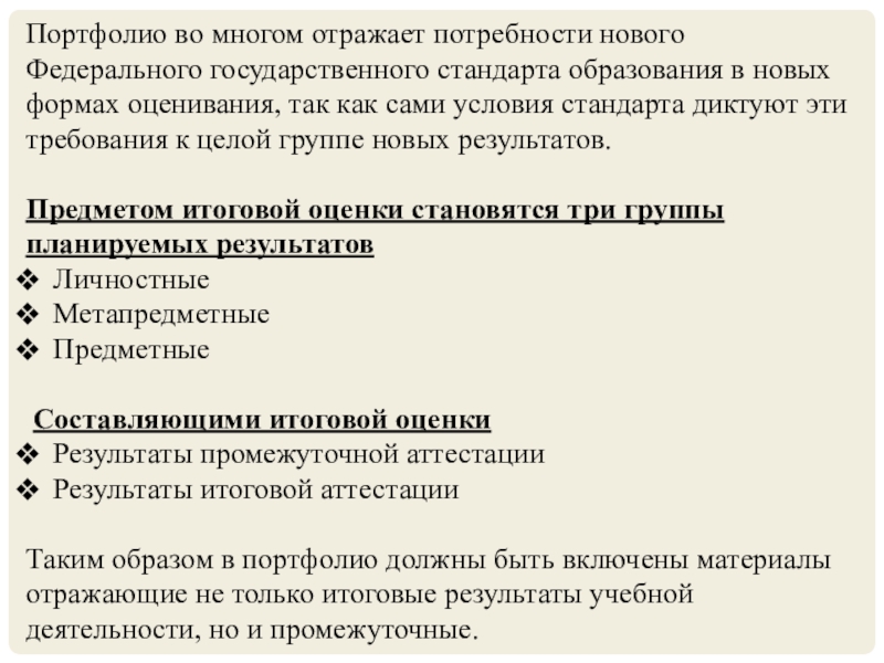Слайд 14Портфолио во многом отражает потребности нового Федерального государственного стандарта образования в