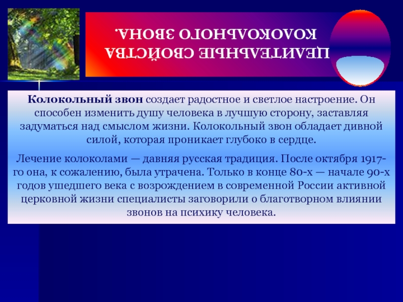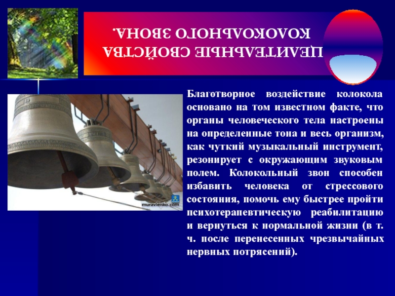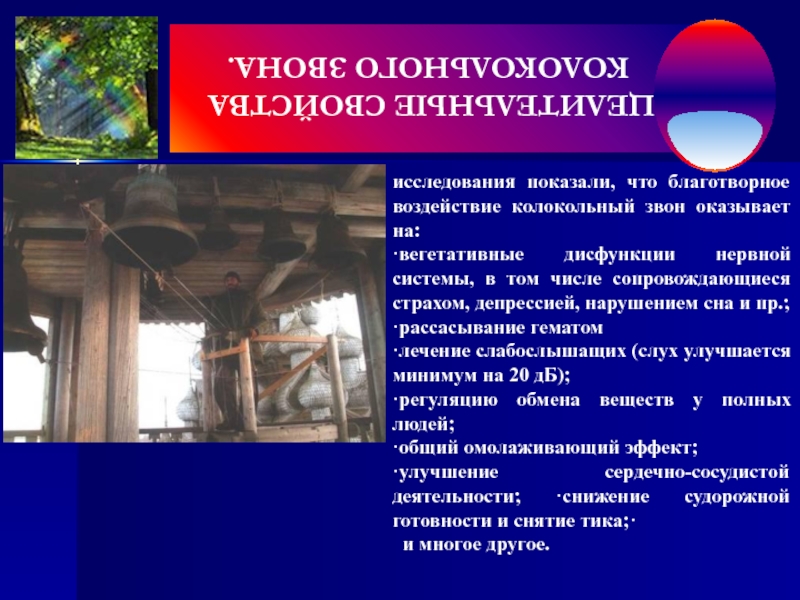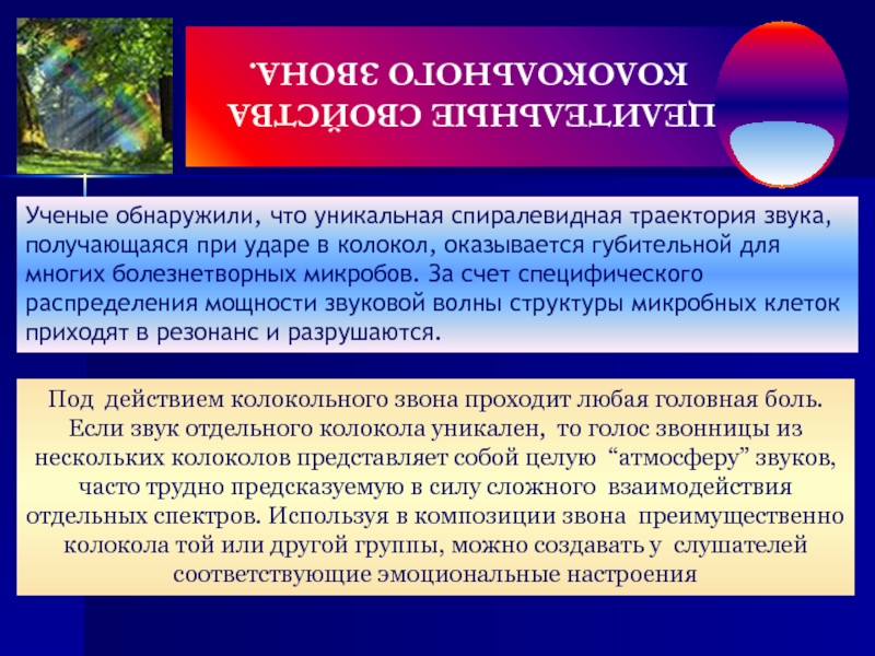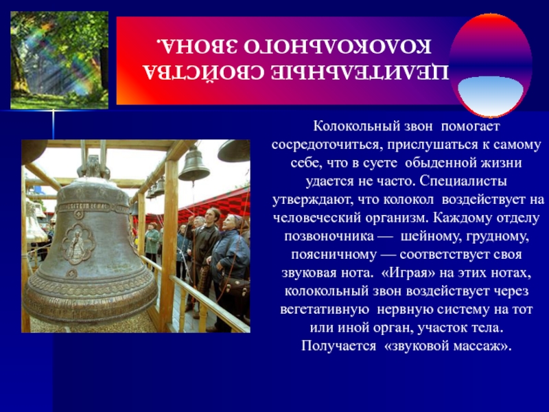 Под действием колокольного звона проходит любая головная боль. Если звук отдельного колокола уникален, то голос звонницы из нескольких колоколов представляет собой целую “атмосферу” звуков, часто трудно предсказуемую в силу сложного взаимодействия отдельных спектров. Используя в композиции звона преимущественно колокола той или другой группы, можно создавать у слушателей соответствующие эмоциональные настроения