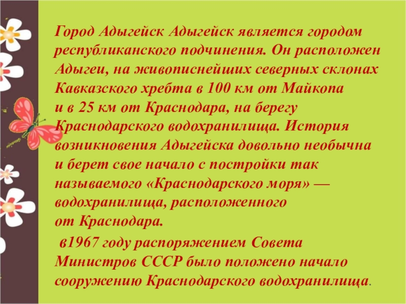 Город Адыгейск Адыгейск является городом республиканского подчинения. Он расположен Адыгеи, на живописнейших северных