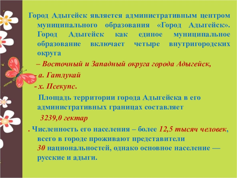 Слайд 9Город Адыгейск является административным центром муниципального образования «Город Адыгейск». Город Адыгейск