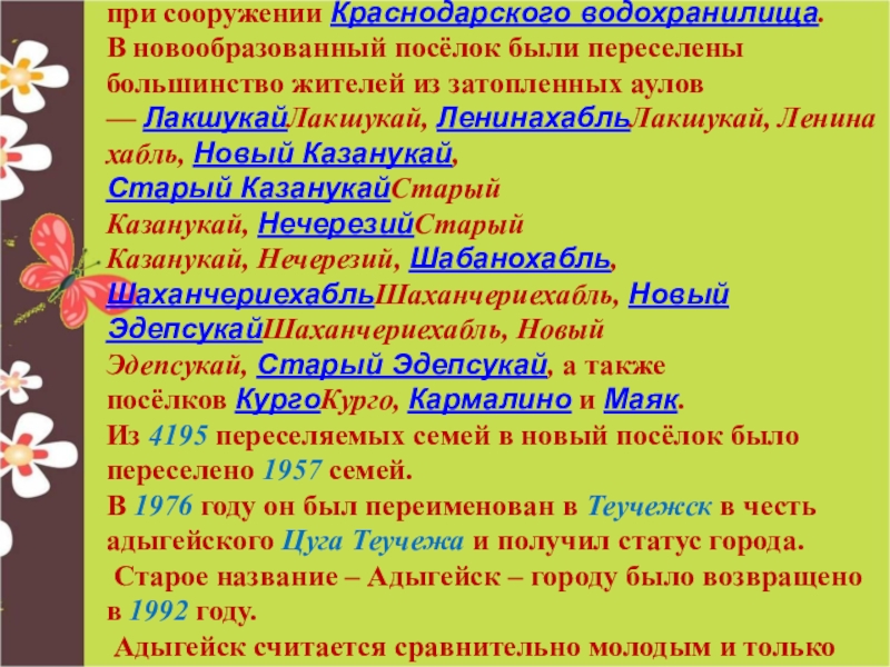 аулов и хуторов, затопленных при сооружении Краснодарского водохранилища.