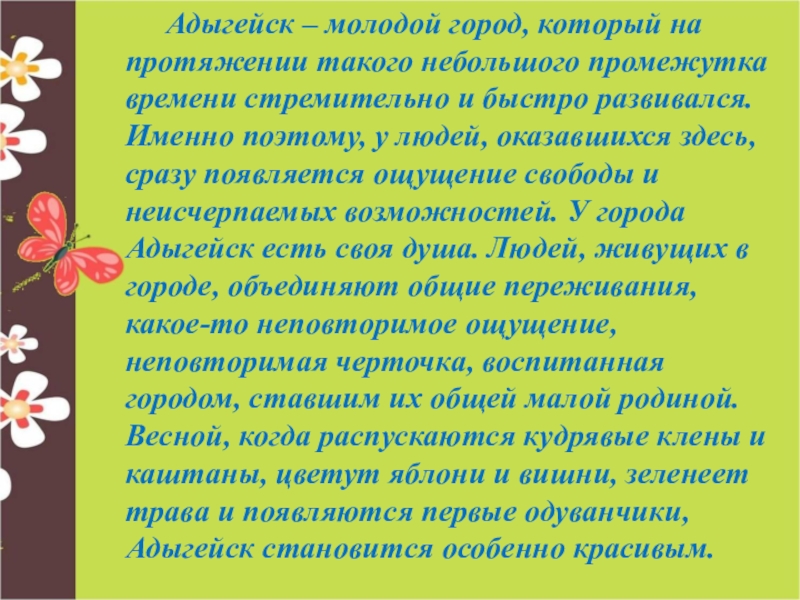 протяжении такого небольшого промежутка времени стремительно и быстро развивался. Именно поэтому, у людей, оказавшихся здесь, сразу появляется ощущение свободы и неисчерпаемых возможностей. У города Адыгейск есть своя душа. Людей, живущих в городе, объединяют общие переживания, какое-то неповторимое ощущение, неповторимая черточка, воспитанная городом, ставшим их общей малой родиной. Весной, когда распускаются кудрявые клены и каштаны, цветут яблони и вишни, зеленеет трава и появляются первые одуванчики, Адыгейск становится особенно красивым.