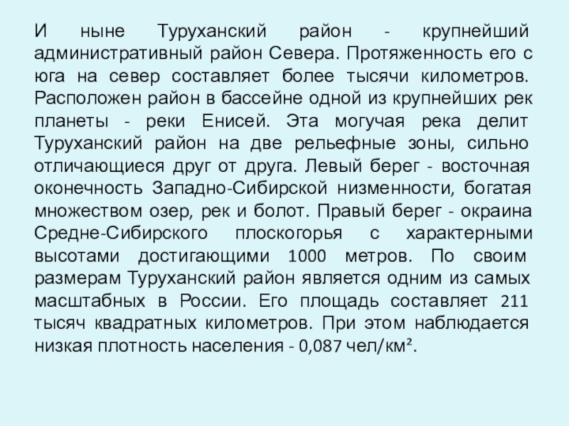 И ныне Туруханский район - крупнейший административный район Севера. Протяженность его