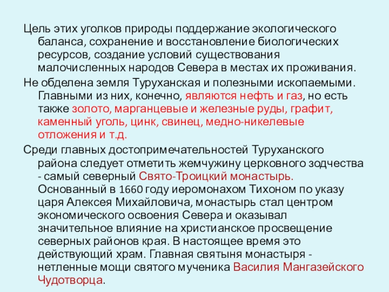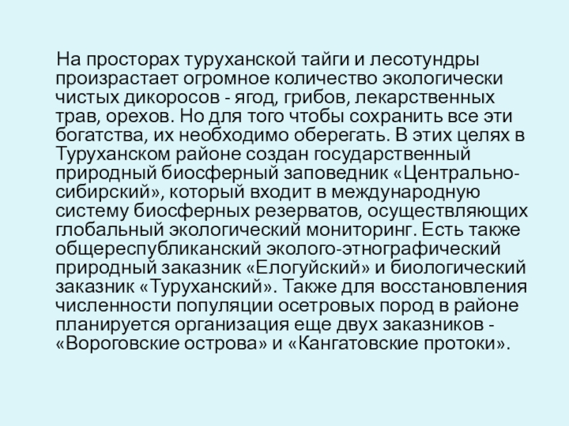 количество экологически чистых дикоросов - ягод, грибов, лекарственных трав, орехов. Но для того чтобы сохранить все эти богатства, их необходимо оберегать. В этих целях в Туруханском районе создан государственный природный биосферный заповедник «Центрально-сибирский», который входит в международную систему биосферных резерватов, осуществляющих глобальный экологический мониторинг. Есть также общереспубликанский эколого-этнографический природный заказник «Елогуйский» и биологический заказник «Туруханский». Также для восстановления численности популяции осетровых пород в районе планируется организация еще двух заказников - «Вороговские острова» и «Кангатовские протоки».