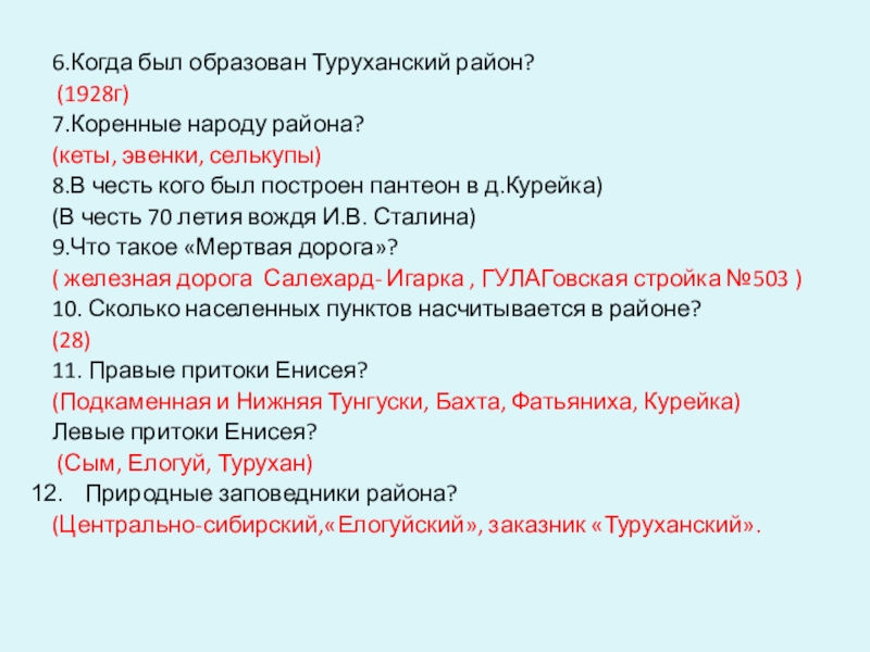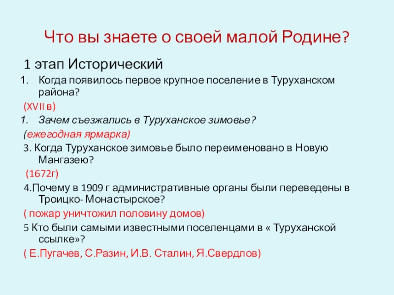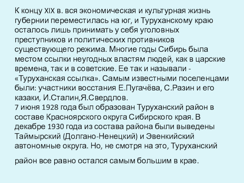 на юг, и Туруханскому краю осталось лишь принимать у себя уголовных преступников и политических противников существующего режима. Многие годы Сибирь была местом ссылки неугодных властям людей, как в царские времена, так и в советские. Ее так и называли - «Туруханская ссылка». Самым известными поселенцами были: участники восстания Е.Пугачёва, С.Разин и его казаки, И.Сталин,Я.Свердлов.