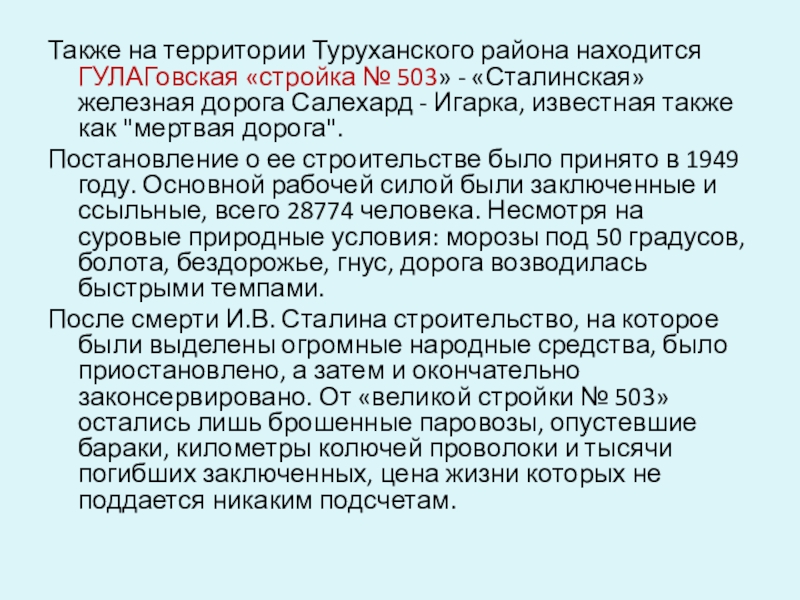 Также на территории Туруханского района находится ГУЛАГовская «стройка № 503» -