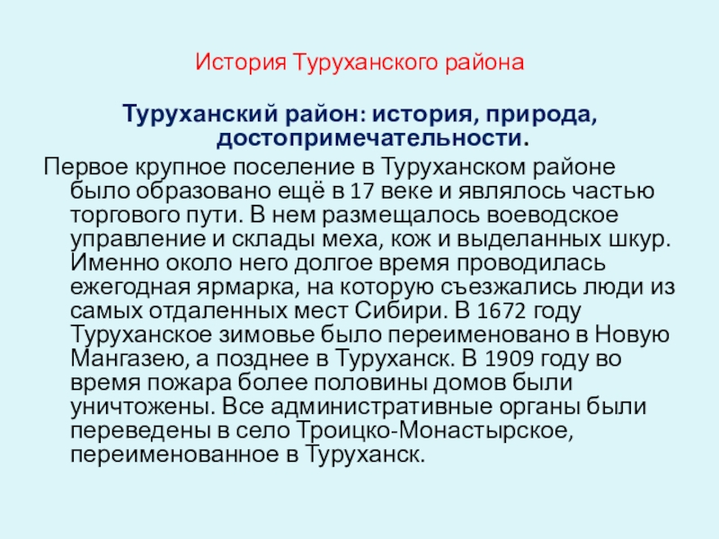 районе было образовано ещё в 17 веке и являлось частью торгового пути. В нем размещалось воеводское управление и склады меха, кож и выделанных шкур. Именно около него долгое время проводилась ежегодная ярмарка, на которую съезжались люди из самых отдаленных мест Сибири. В 1672 году Туруханское зимовье было переименовано в Новую Мангазею, а позднее в Туруханск. В 1909 году во время пожара более половины домов были уничтожены. Все административные органы были переведены в село Троицко-Монастырское, переименованное в Туруханск.