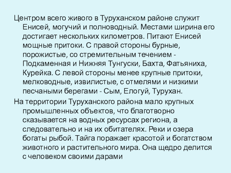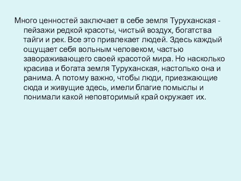 чистый воздух, богатства тайги и рек. Все это привлекает людей. Здесь каждый ощущает себя вольным человеком, частью завораживающего своей красотой мира. Но насколько красива и богата земля Туруханская, настолько она и ранима. А потому важно, чтобы люди, приезжающие сюда и живущие здесь, имели благие помыслы и понимали какой неповторимый край окружает их.