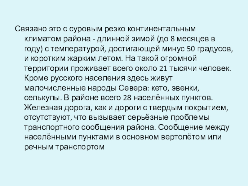(до 8 месяцев в году) с температурой, достигающей минус 50 градусов, и коротким жарким летом. На такой огромной территории проживает всего около 21 тысячи человек. Кроме русского населения здесь живут малочисленные народы Севера: кето, эвенки, селькупы. В районе всего 28 населённых пунктов. Железная дорога, как и дороги с твердым покрытием, отсутствуют, что вызывает серьёзные проблемы транспортного сообщения района. Сообщение между населёнными пунктами в основном вертолётом или речным транспортом