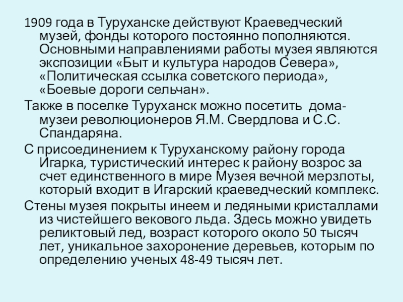 1909 года в Туруханске действуют Краеведческий музей, фонды которого постоянно пополняются.