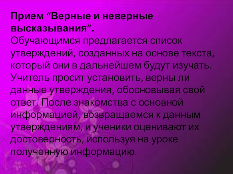 текста, который они в дальнейшем будут изучать. Учитель просит установить, верны ли данные утверждения, обосновывая свой ответ. После знакомства с основной информацией, возвращаемся к данным утверждениям, и ученики оценивают их достоверность, используя на уроке полученную информацию.