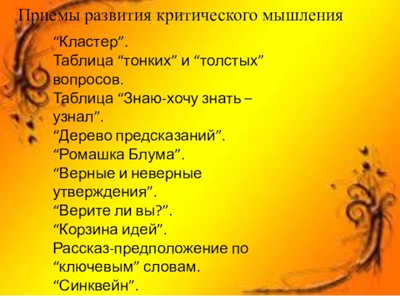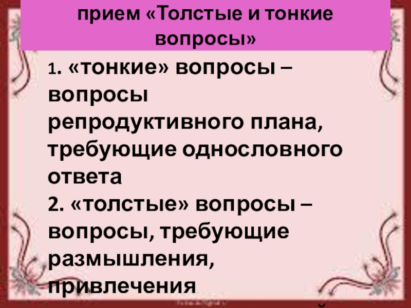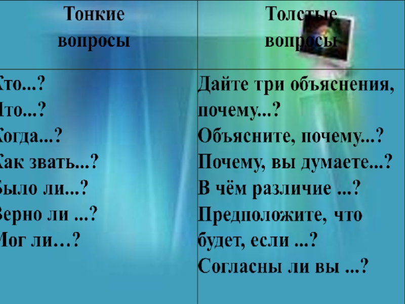 2. «толстые» вопросы – вопросы, требующие размышления, привлечения дополнительных знаний, умения анализировать