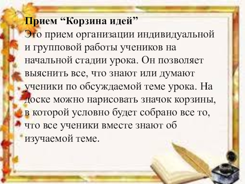 начальной стадии урока. Он позволяет выяснить все, что знают или думают ученики по обсуждаемой теме урока. На доске можно нарисовать значок корзины, в которой условно будет собрано все то, что все ученики вместе знают об изучаемой теме.