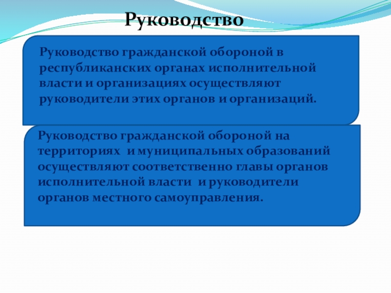 Руководство гражданской обороной на территориях и муниципальных образований осуществляют соответственно главы органов исполнительной власти и руководители органов местного самоуправления.