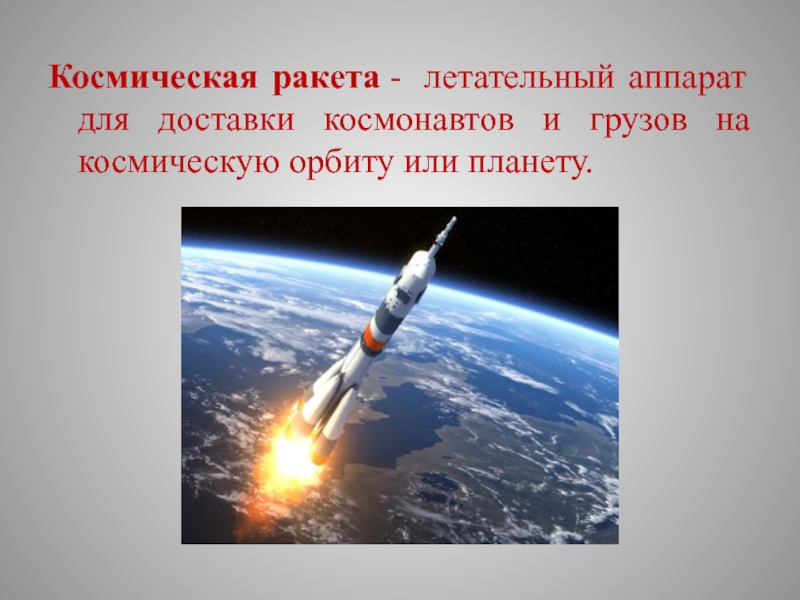 Слайд 10Космическая ракета -  летательный аппарат для доставки космонавтов и грузов на космическую