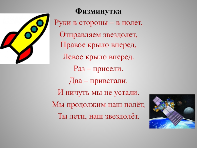 Физминутка Руки в стороны – в полет, Отправляем звездолет,