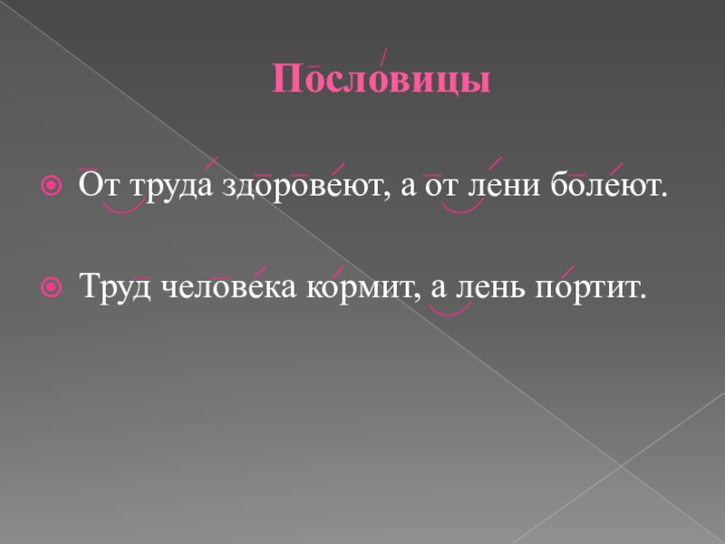 ПословицыОт труда здоровеют, а от лени болеют.Труд человека кормит, а лень портит.