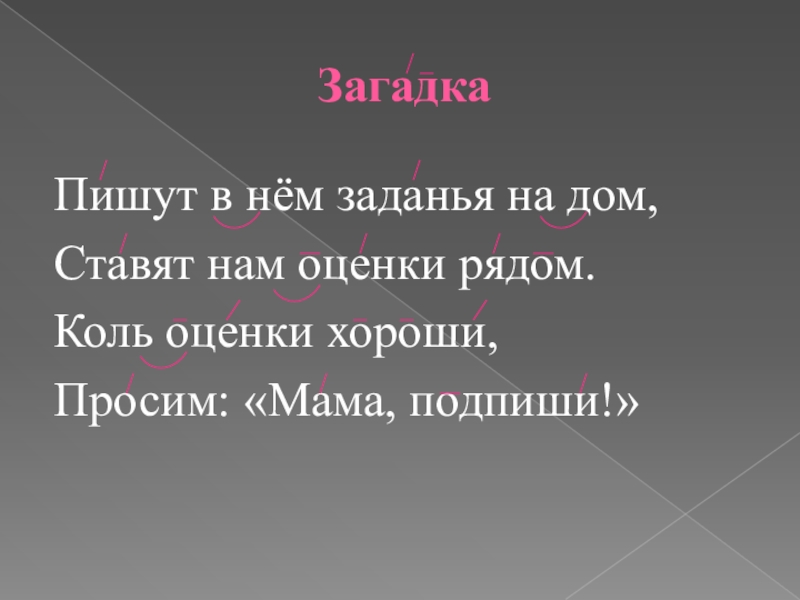 ЗагадкаПишут в нём заданья на дом, Ставят нам оценки рядом.Коль оценки хороши,Просим: «Мама, подпиши!»
