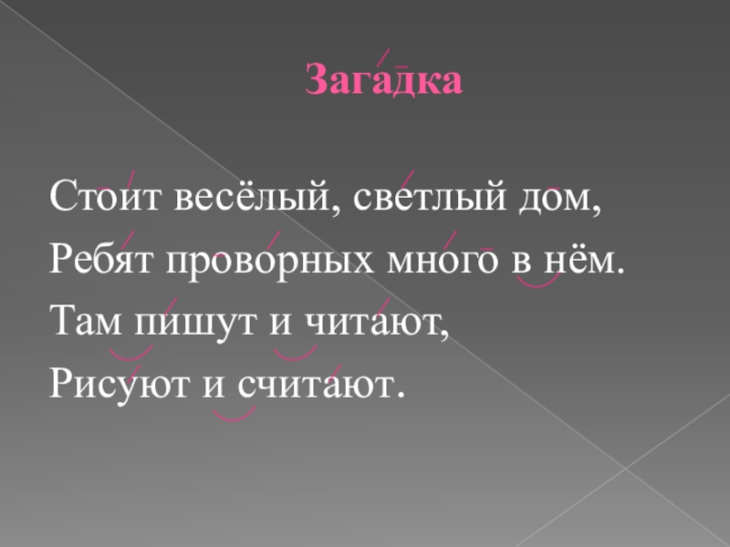 ЗагадкаСтоит весёлый, светлый дом,Ребят проворных много в нём.Там пишут и читают,Рисуют и считают.