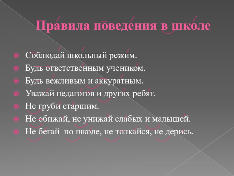 Правила поведения в школеСоблюдай школьный режим.Будь ответственным учеником.Будь вежливым и аккуратным.Уважай педагогов и других ребят.Не груби старшим.Не