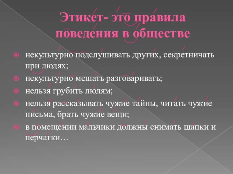 Этикет- это правила поведения в общественекультурно подслушивать других, секретничать при людях;некультурно мешать разговаривать;нельзя грубить людям;нельзя рассказывать чужие