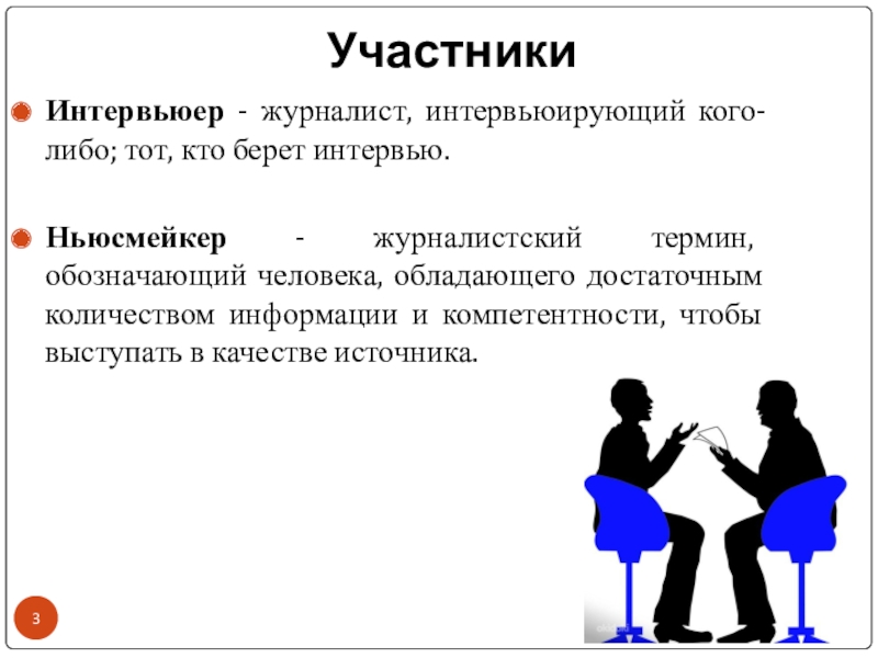 УчастникиИнтервьюер - журналист, интервьюирующий кого-либо; тот, кто берет интервью.Ньюсмейкер - журналистский термин, обозначающий человека, обладающего достаточным количеством