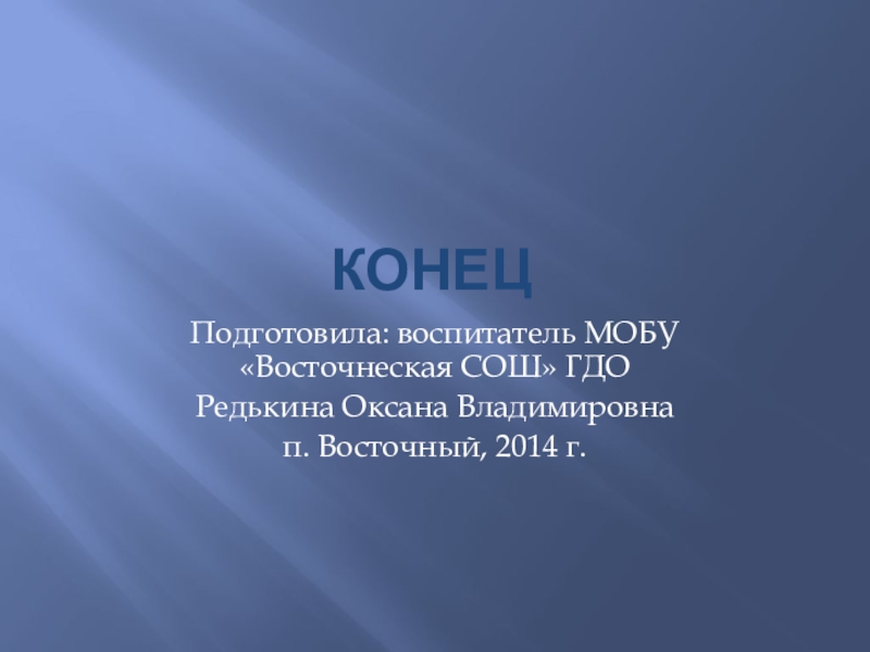 КОНЕЦПодготовила: воспитатель МОБУ «Восточнеская СОШ» ГДОРедькина Оксана Владимировнап. Восточный, 2014 г.