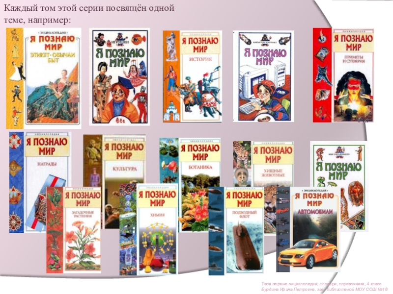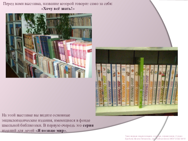 На этой выставке вы видите основные энциклопедические издания, имеющиеся в фонде школьной библиотеки. В первую очередь это серия изданий для детей «Я познаю мир».
