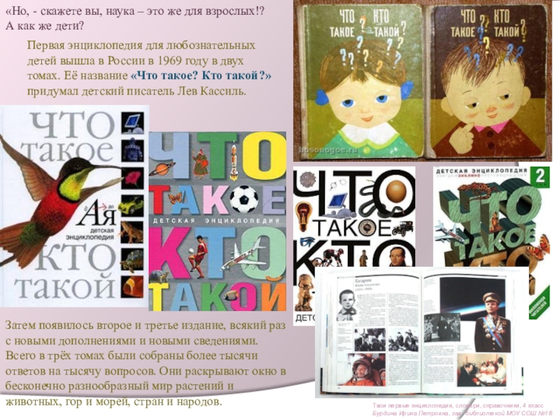 Первая энциклопедия для любознательных детей вышла в России в 1969 году в двух томах. Её название «Что такое? Кто такой?» придумал детский писатель Лев Кассиль.