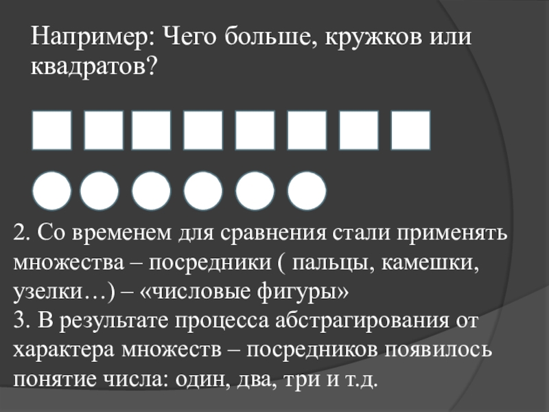 Например: Чего больше, кружков или квадратов?