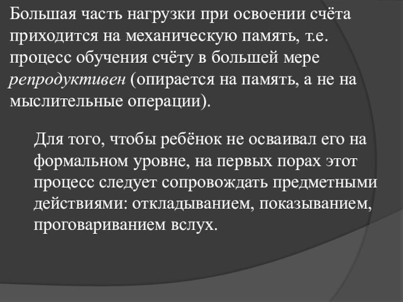 Для того, чтобы ребёнок не осваивал его на формальном уровне, на первых порах этот процесс следует сопровождать предметными действиями: откладыванием, показыванием, проговариванием вслух.