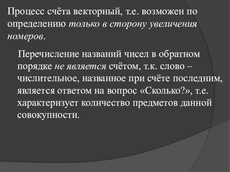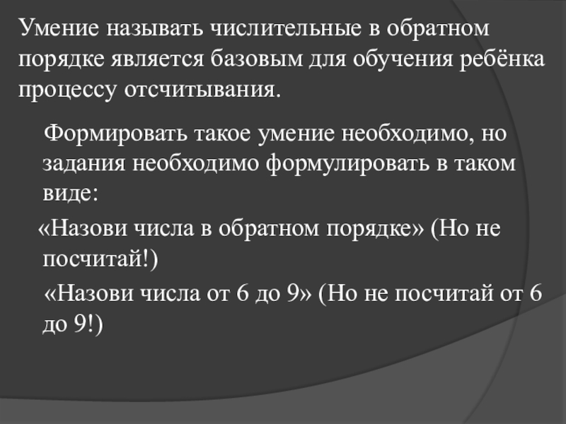 Перечисление названий чисел в обратном порядке не является счётом, т.к. слово – числительное, названное при счёте последним, является ответом на вопрос «Сколько?», т.е. характеризует количество предметов данной совокупности.