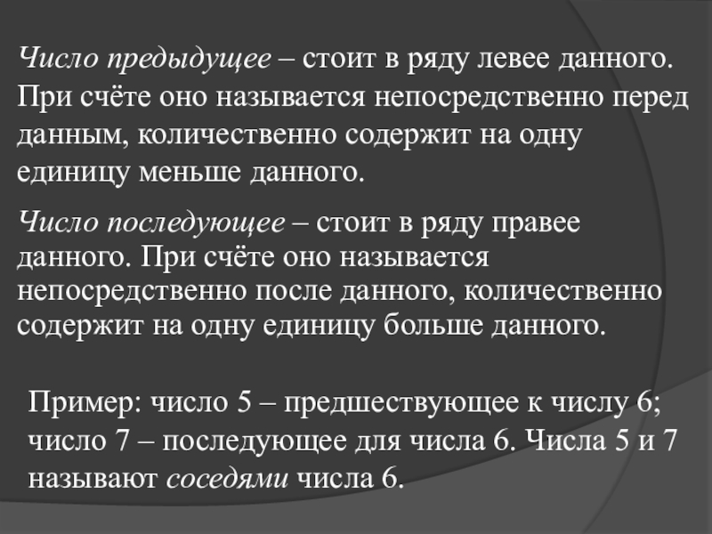 Пример: число 5 – предшествующее к числу 6; число 7 – последующее для числа 6. Числа 5 и 7 называют соседями числа 6.