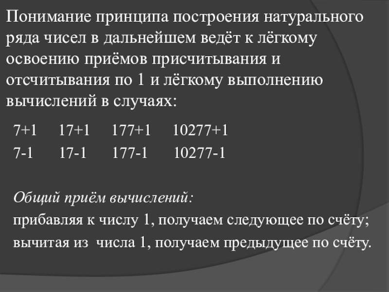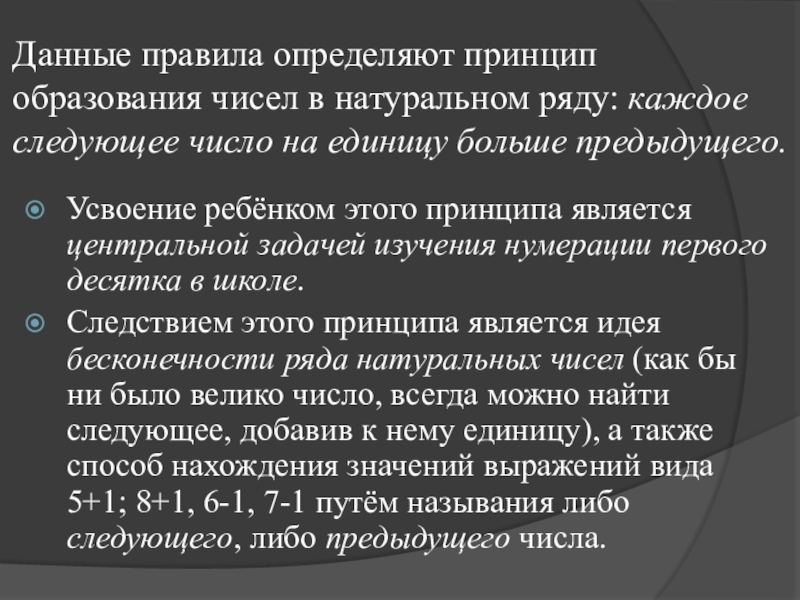 Следствием этого принципа является идея бесконечности ряда натуральных чисел (как бы ни было велико число, всегда можно найти следующее, добавив к нему единицу), а также способ нахождения значений выражений вида 5+1; 8+1, 6-1, 7-1 путём называния либо следующего, либо предыдущего числа.