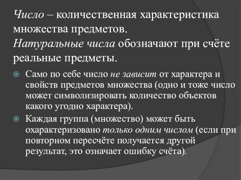 Само по себе число не зависит от характера и свойств предметов множества (одно и тоже число может символизировать количество объектов какого угодно характера).