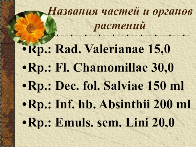 Названия частей и органов растенийRp.: Rad. Valerianae 15,0Rp.: Fl. Chamomillae 30,0Rp.: Dec. fol. Salviae 150 mlRp.: Inf.