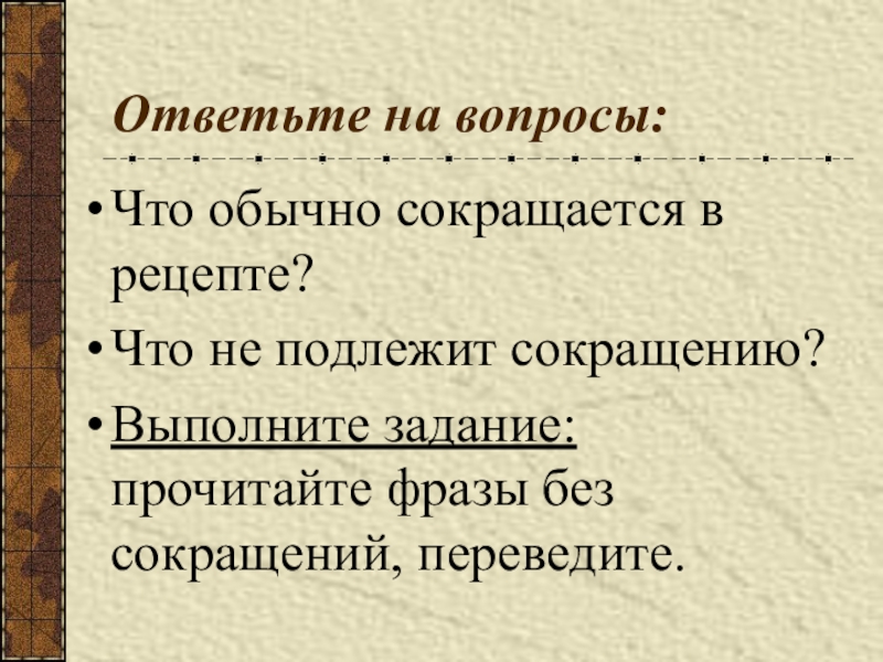 Ответьте на вопросы:Что обычно сокращается в рецепте?Что не подлежит сокращению?Выполните задание: прочитайте фразы без сокращений, переведите.