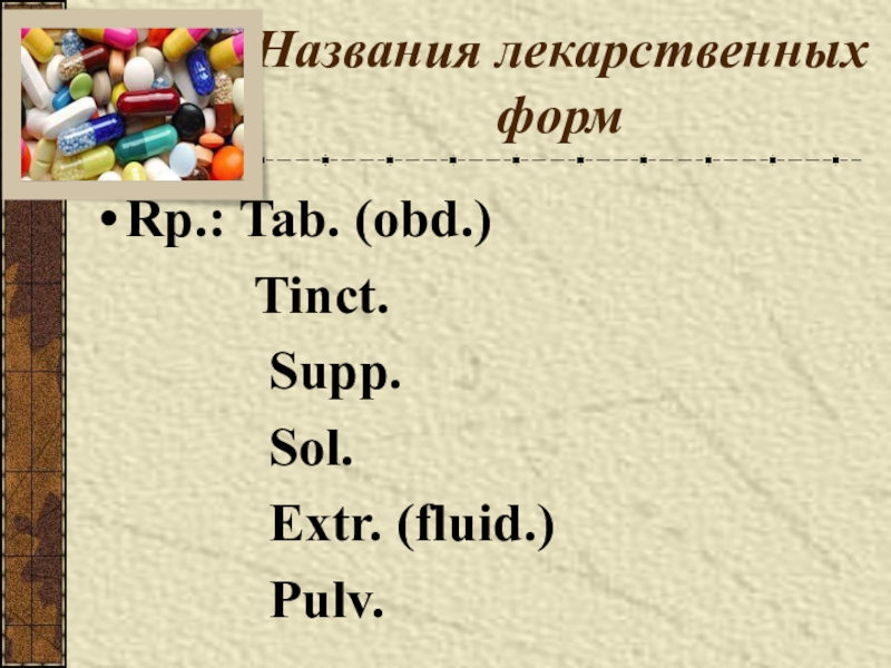 Названия лекарственных формRp.: Tab. (obd.)      Tinct.