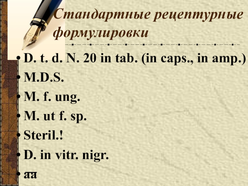 Стандартные рецептурные формулировкиD. t. d. N. 20 in tab. (in caps., in amp.)M.D.S.M. f. ung.M. ut f.