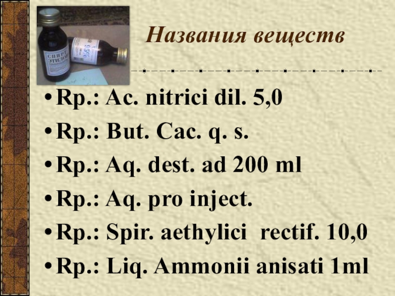 Названия веществRp.: Ac. nitrici dil. 5,0Rp.: But. Cac. q. s.Rp.: Aq. dest. ad 200 mlRp.: Aq. pro