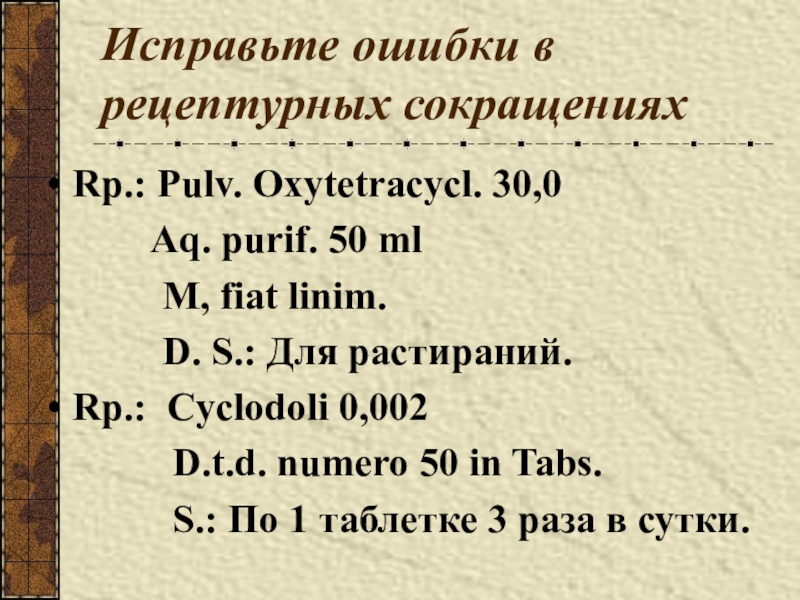 Слайд 7Исправьте ошибки в рецептурных сокращениях