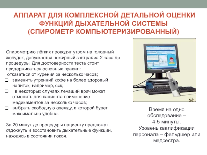 Спирометрию лёгких проводят утром на голодный желудок, допускается нежирный завтрак за 2 часа до процедуры. Для достоверности теста стоит придерживаться основных правил: