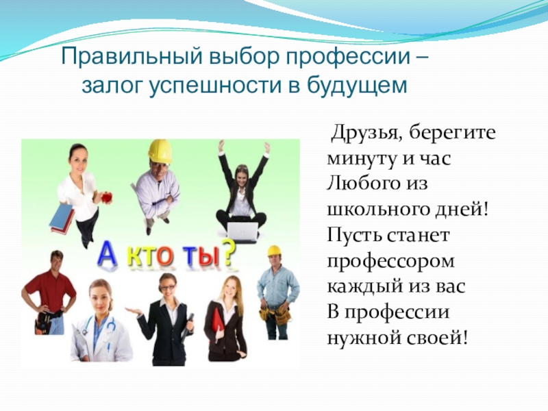 Правильный выбор профессии – залог успешности в будущем Друзья, берегите минуту и часЛюбого из школьного дней!Пусть станет