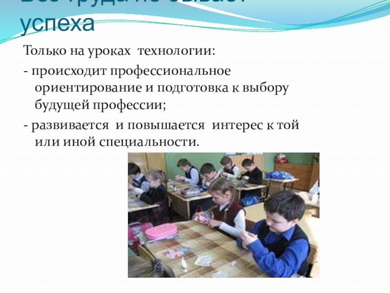 Без труда не бывает успехаТолько на уроках технологии:- происходит профессиональное ориентирование и подготовка к выбору будущей профессии;-