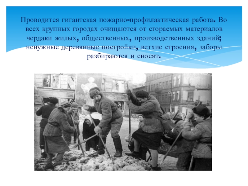 Слайд 11Проводится гигантская пожарно-профилактическая работа. Во всех крупных городах очищаются от сгораемых