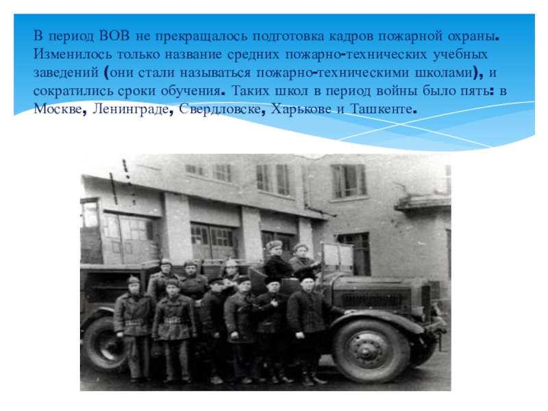 название средних пожарно-технических учебных заведений (они стали называться пожарно-техническими школами), и сократились сроки обучения. Таких школ в период войны было пять: в Москве, Ленинграде, Свердловске, Харькове и Ташкенте.