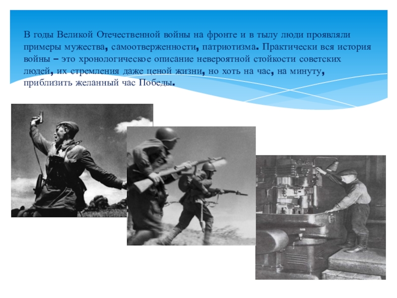 проявляли примеры мужества, самоотверженности, патриотизма. Практически вся история войны – это хронологическое описание невероятной стойкости советских людей, их стремления даже ценой жизни, но хоть на час, на минуту, приблизить желанный час Победы.